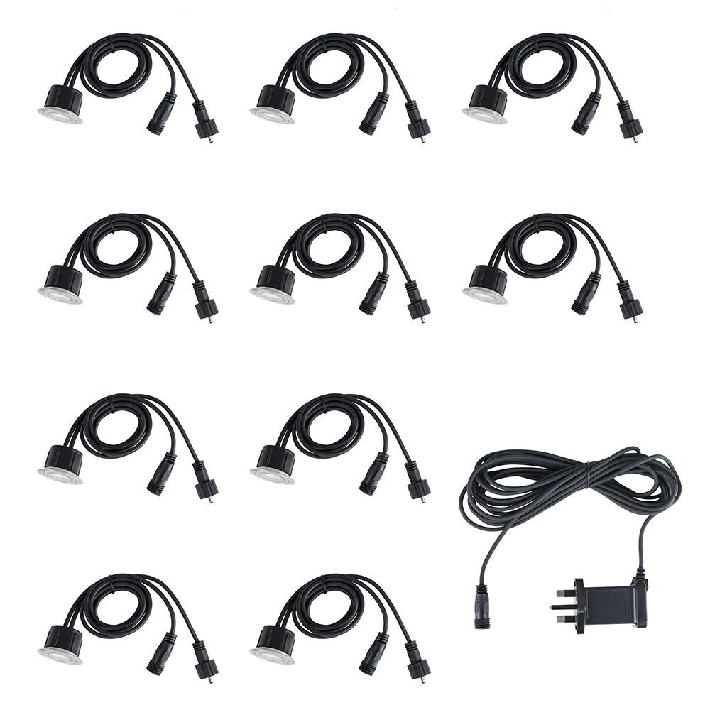 This stainless steel decking/plinth light kit includes 10 lights plus transformer, all cables and connections etc. It’s an ideal way to transform your outdoor space, you would be amazed at the difference 10 little lights can make! This kit is available in your choice of 2 different colour options – Warm White LED or Cool White LED. Warm white is often used as a cosy ambient light whereas Cool white is better for task lighting as it’s brighter, it’s really a case of personal preference.