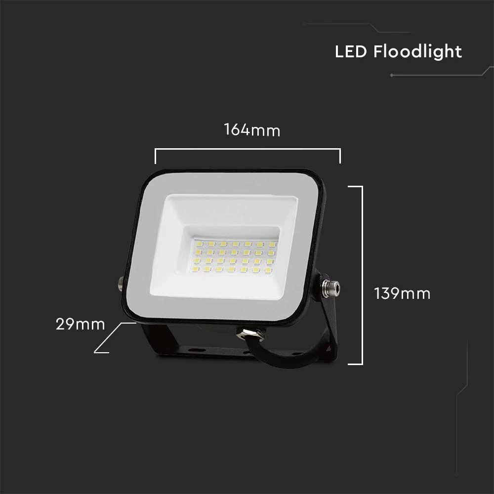 This LED lighting fixture comes in a black finish in a cool white light. The outdoor light is a high lumen LED light delivering 80 lumens per watt. This slimline LED floodlight measures 164x29x139mm and it’s suitable for high output lighting applications with a beam angle of more than 120°.