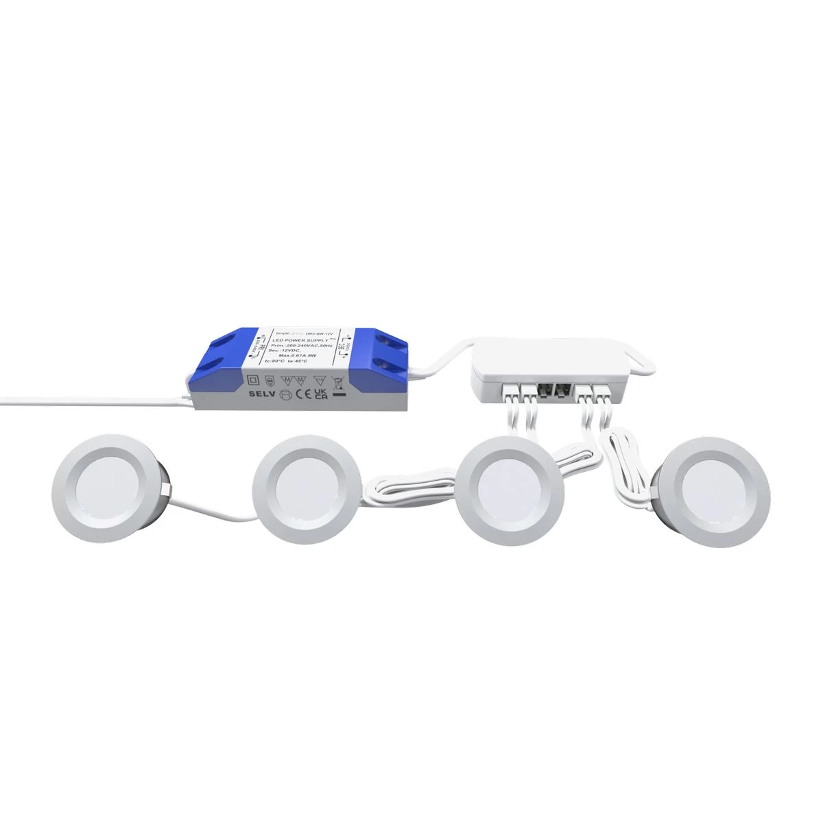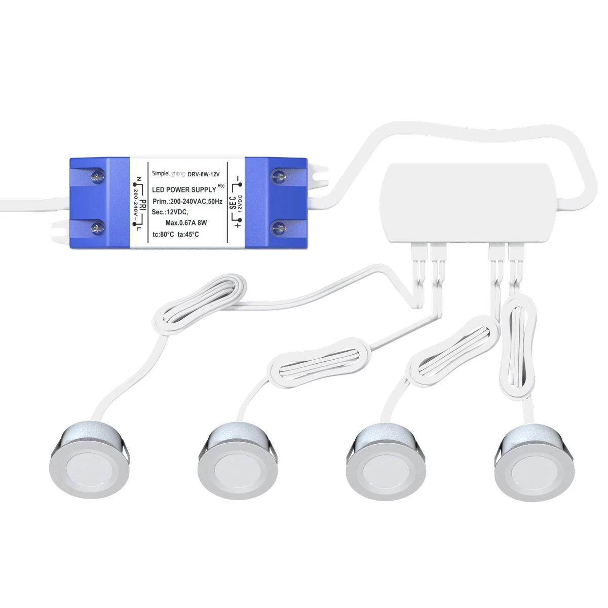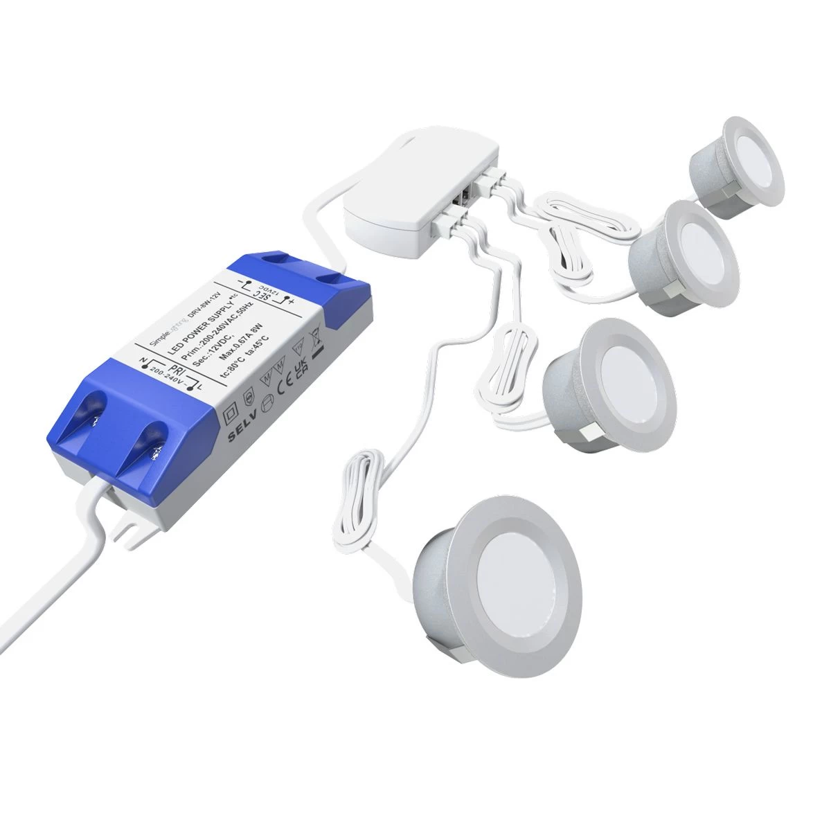 This set includes 4 Round 30mm LED Plinth Lights and an 8W LED Driver. If 4 lights are not enough, you can expand this kit to a maximum of 6 lights by purchasing 2 additional single Round 30mm LED Plinth Lights (Product Code: PL-1W-4000k).