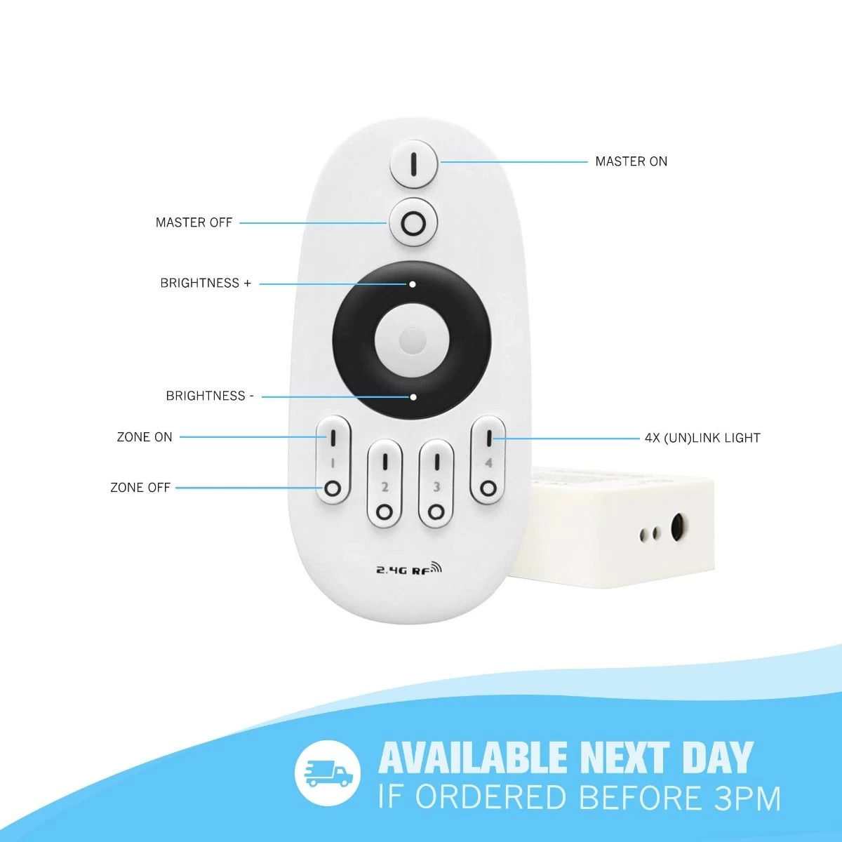 This LED dimmer is a 4-channel unit that lets you simultaneously control the lighting in 4 different rooms or zones. This means you have a universal remote that can control your lights in different parts of your home or different zones in a room!