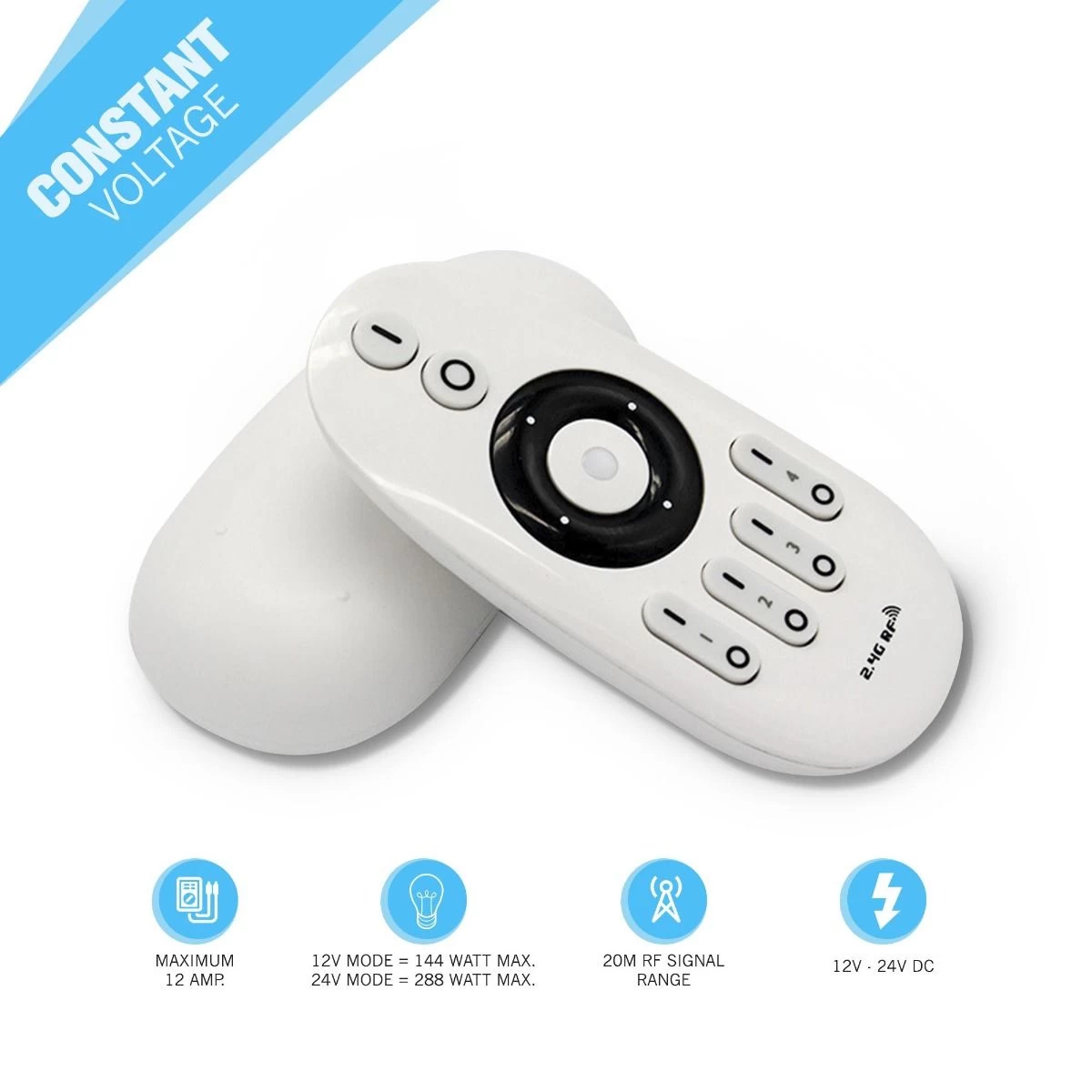 This LED dimmer set is compatible with our extensive collection of single-coloured LED tapes and 12v DC or 24v DC under cabinet lights. Just note that 12v has a maximum wattage of 144w while 24v has a maximum wattage of 288w. Stay within that range, and you’ll have nothing to worry about!