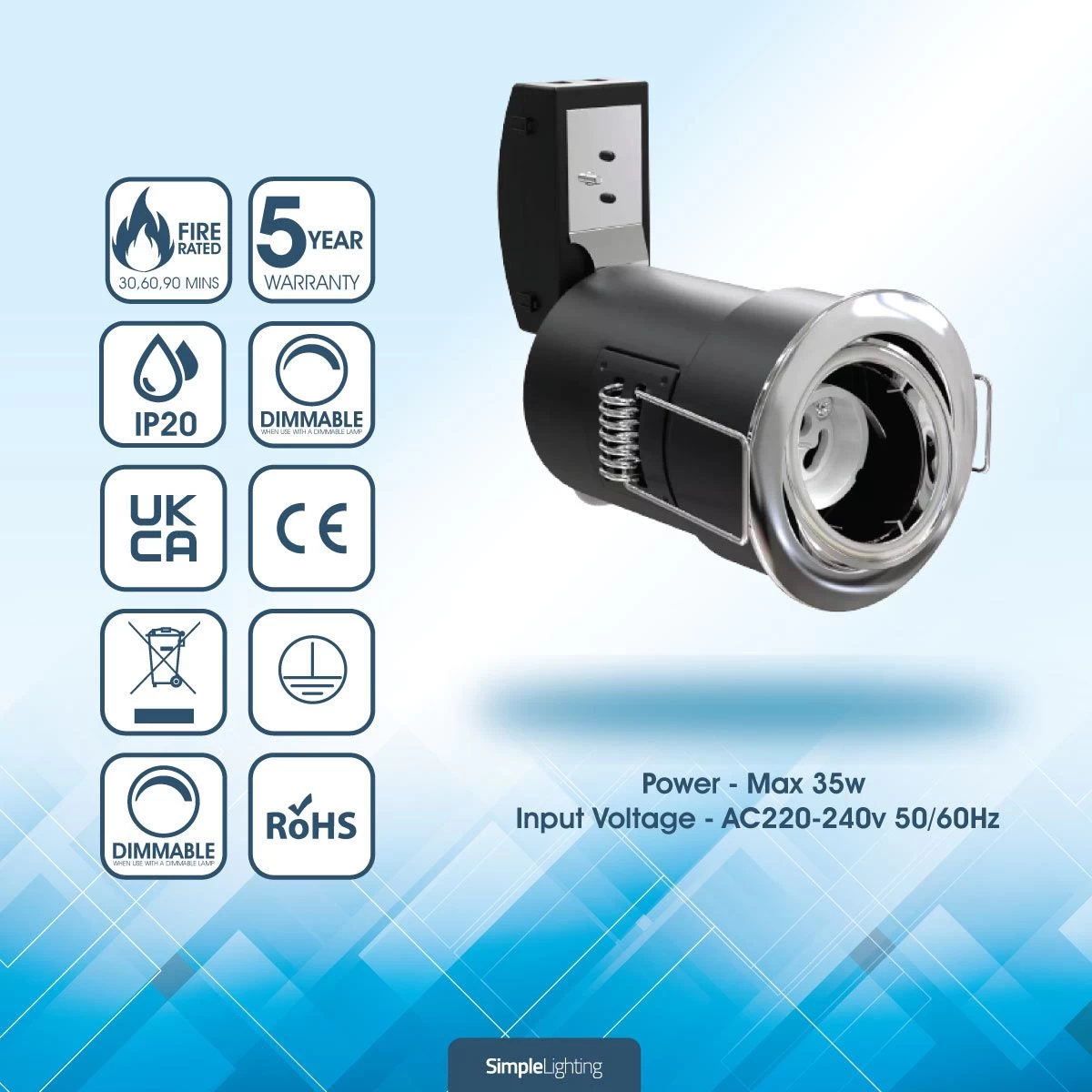 - Pack of 50 GU10 Downlight, Fixed, Die Cast in a Chrome Finish