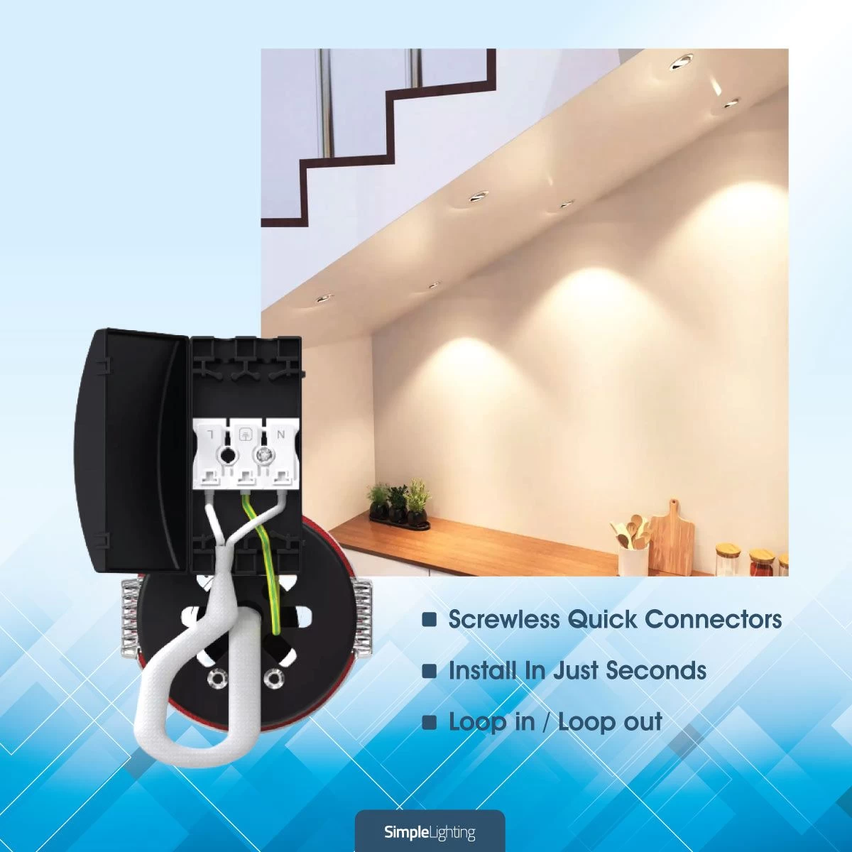 - Easy installation! This downlight has a large loop-in/out terminal block, screwless push-fit connectors, and a twist and lock mechanism. Aside from that, it’s mains powered, so you don’t need a driver to make it run. Just remember it’s 95mm diameter, 115mm height and 85mm cut-out hole to make sure you have an excellent fit.