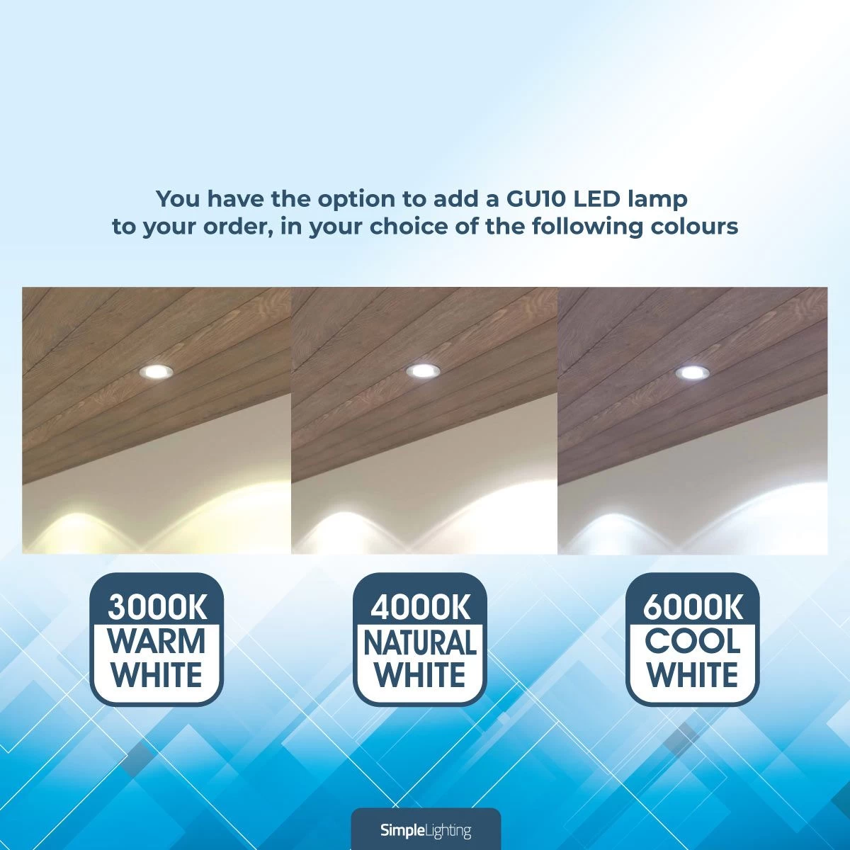 - Pack of 50 Fixed, GU10, Die Cast Downlight with a White Bezel