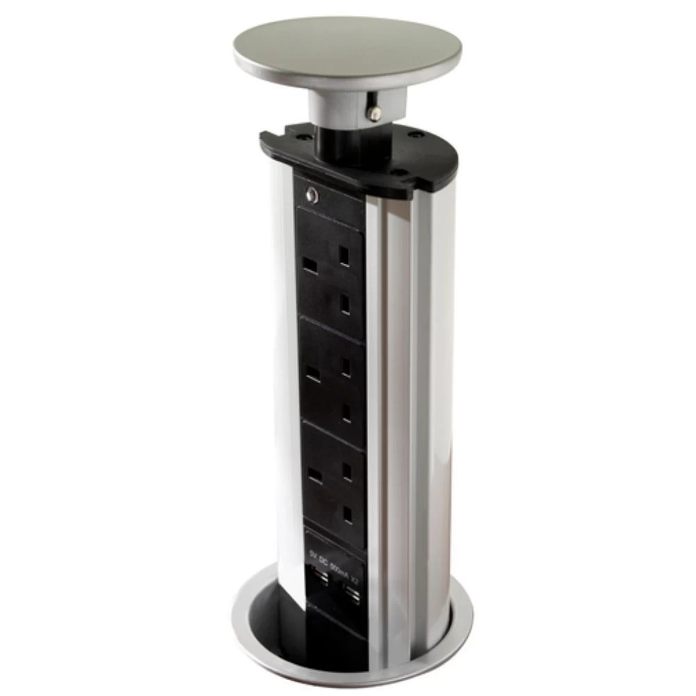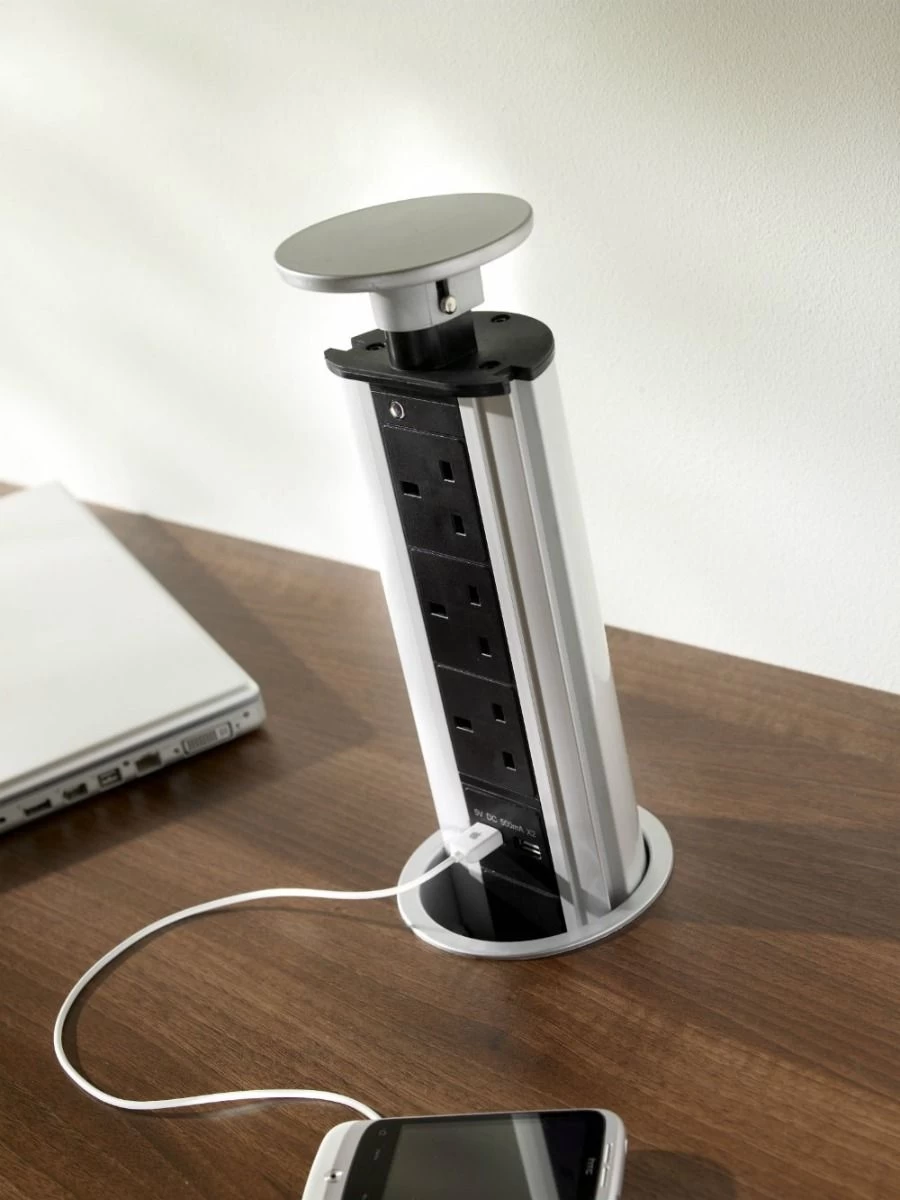 This pop-up socket is basically a modern, permanent extension socket with a 1.5-metre cable with a plug on the end so it’s very easy to install, once you’ve checked that you have enough space below the area you wish to install it in (make sure there are no drawers or pipes), and checked that you have a spare wall socket to plug it into, just cut out a hole of 102-105mm and pop it in, then simply plug it into the wall socket and you’re ready to go.