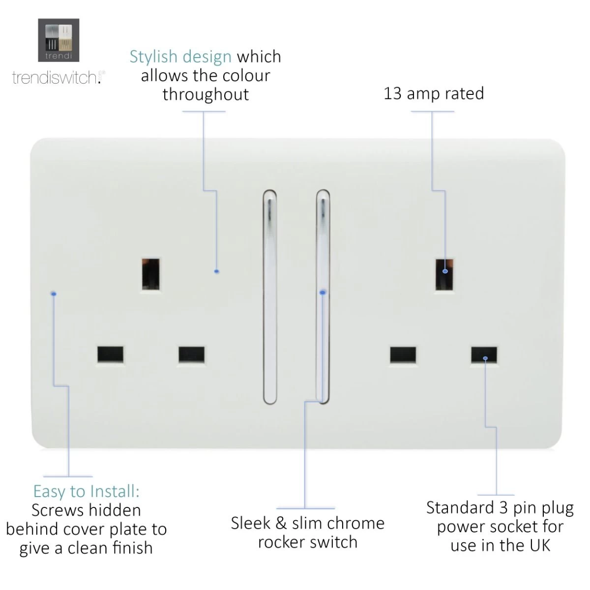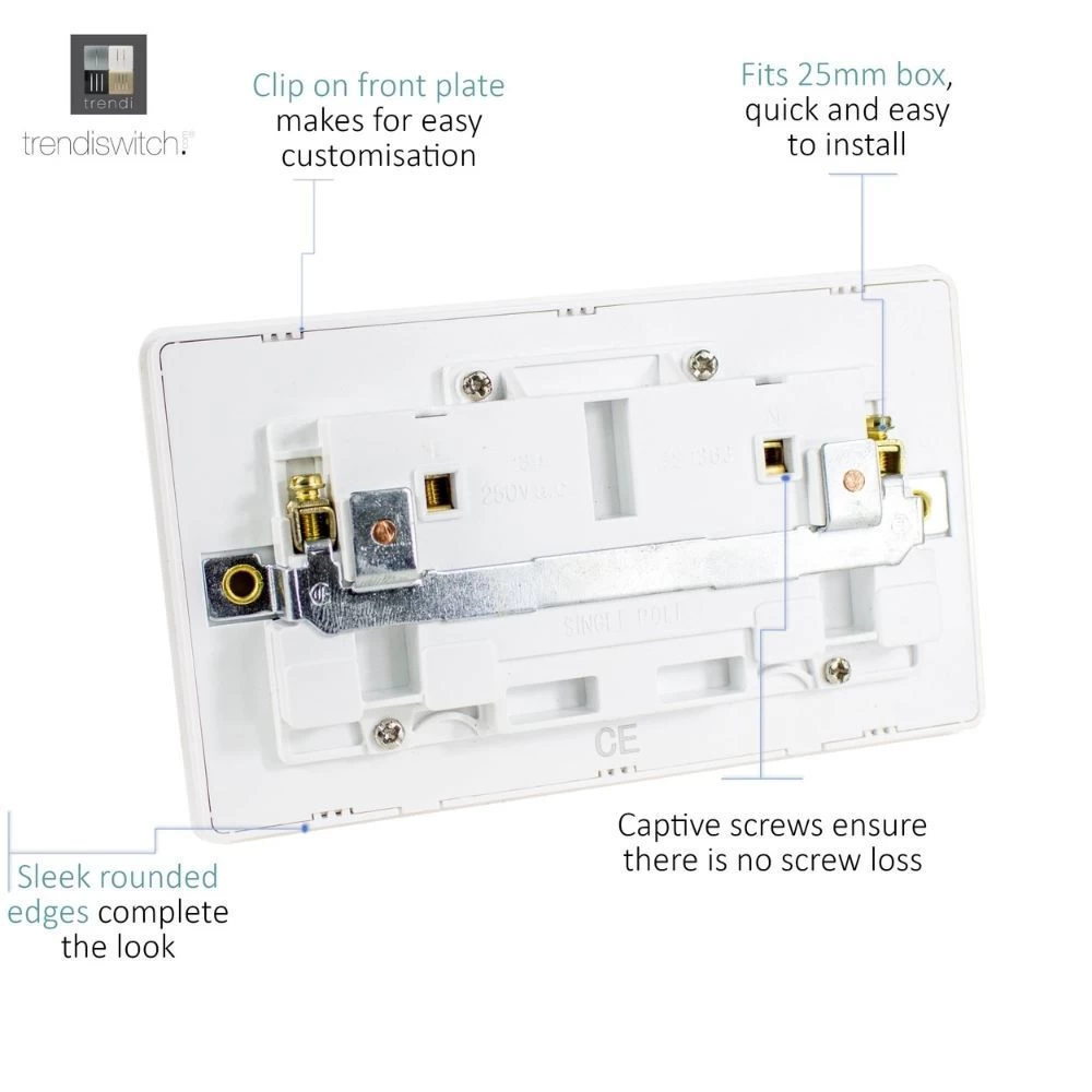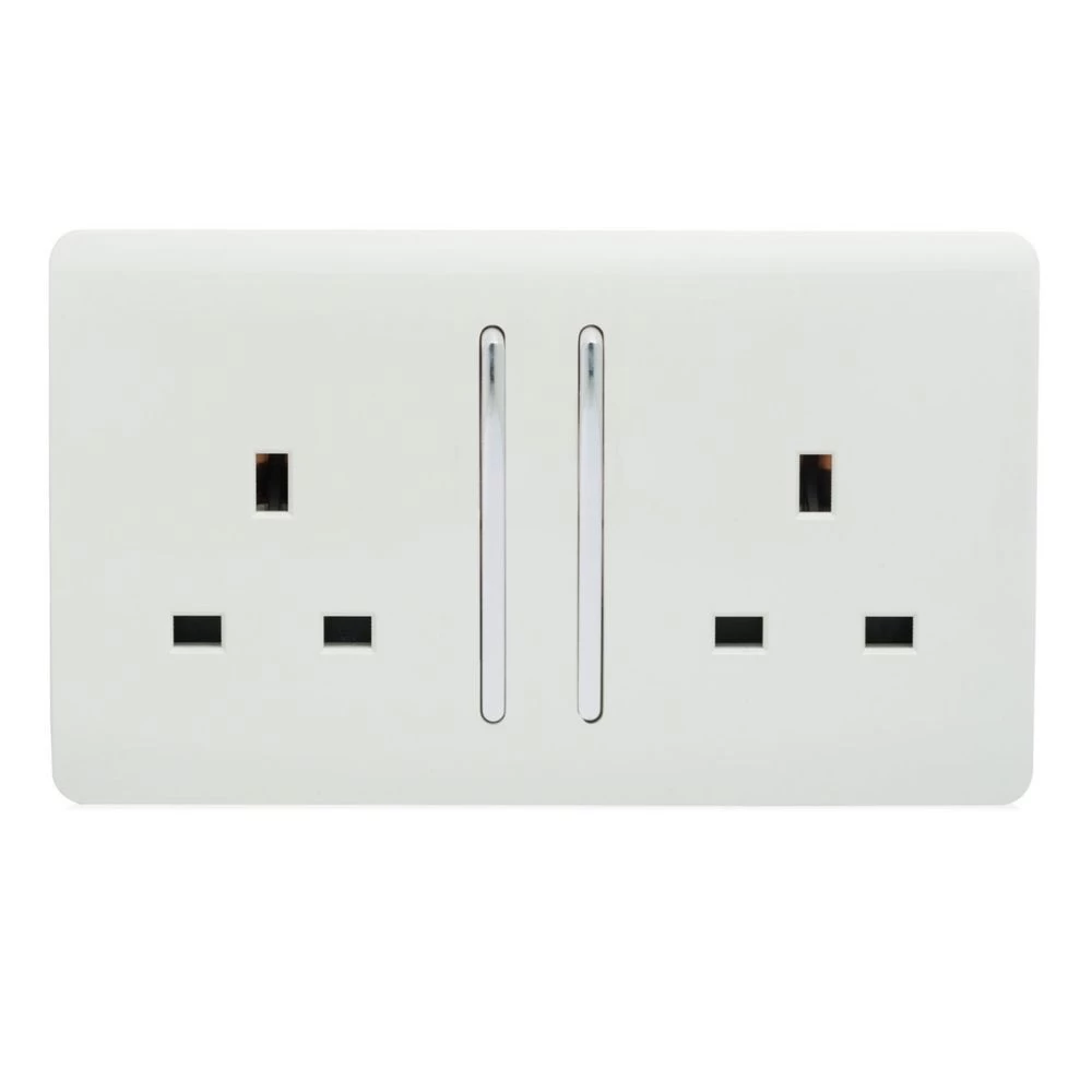 Trendi 1 Gang Artistic Modern Glossy Screwless 13 Amp Plug Socket Long WhiteThis Trendi 2 Gang Artistic Modern Glossy Screwless 13 Amp Double Plug Socket has a fabulous glossy white finish with two stylish rocker switches and plug sockets. It’s part of the wide-ranging Trendiswitch series, which is composed of modern, designer switches and sockets that will not only satisfy your visual senses but are also easy to use, hard wearing & affordable (shhh)! By adding a sprinkle of Trendiswitches in your home, the luxury vibe will follow!