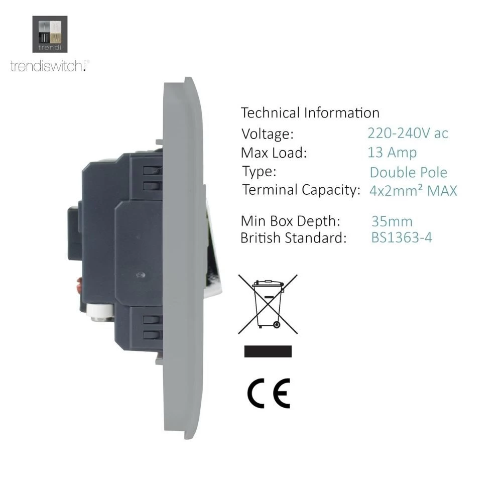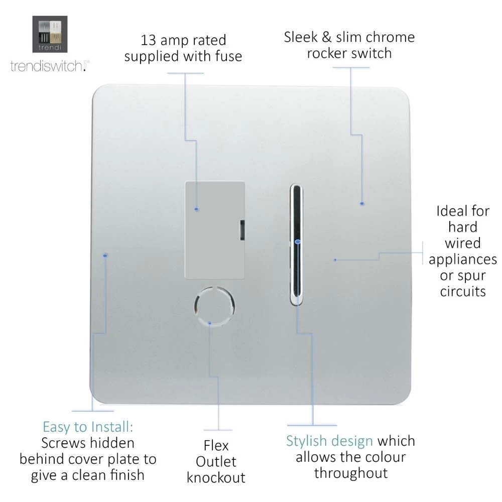 This Trendi Artistic Modern Glossy Screwless Fused Spur Switch is made with a glossy silver finish, sleek chrome switch, flex knockout socket, and a 13 AMP fused spur. It’s featured in the Trendiswitch collection, which focuses on modern designer switches and sockets with top-class elegant visuals, guaranteed durability, and shockingly low price! It’s a luxury piece that you’ll never feel guilty buying.
